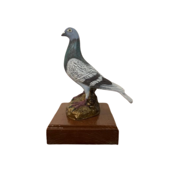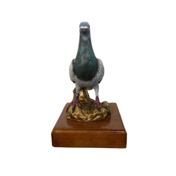 Trofeo decorativo con figura de paloma mensajera en posición de pie, fabricado en resina de alta calidad y montado sobre base de madera. Ideal para premiaciones, reconocimientos y eventos deportivos de colombofilia.
